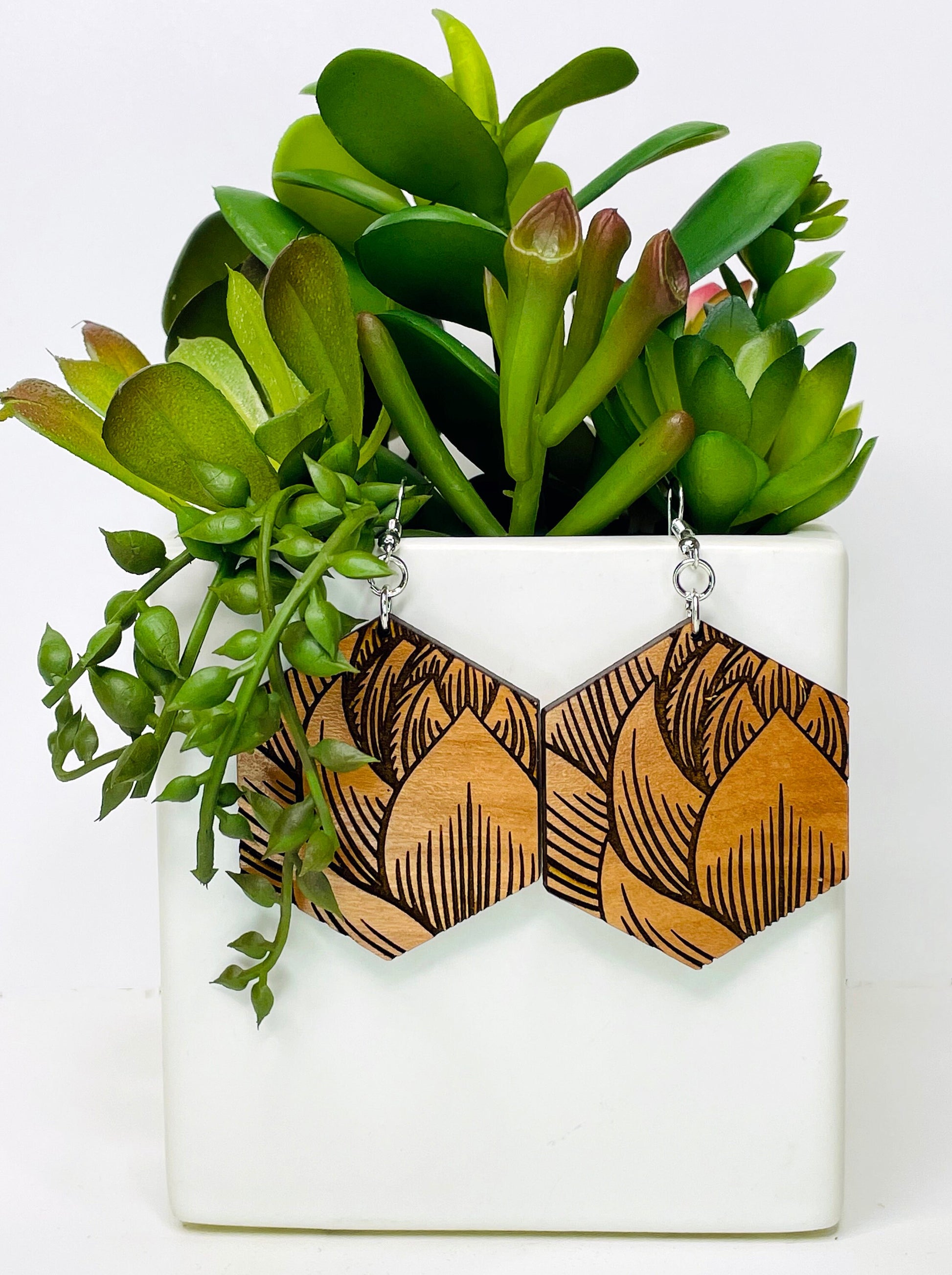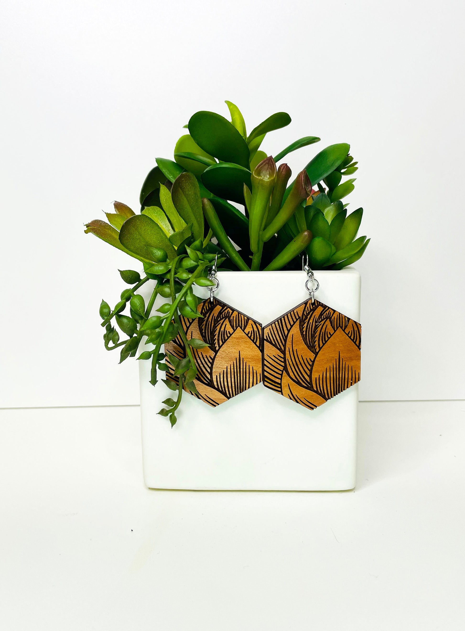 These Abstract Lotus Earring are laser cut and engraved out of birch, cherry, sapele, or walnut and sealed to ensure the surface isn't easily damaged. The earrings pictured are of cherry.