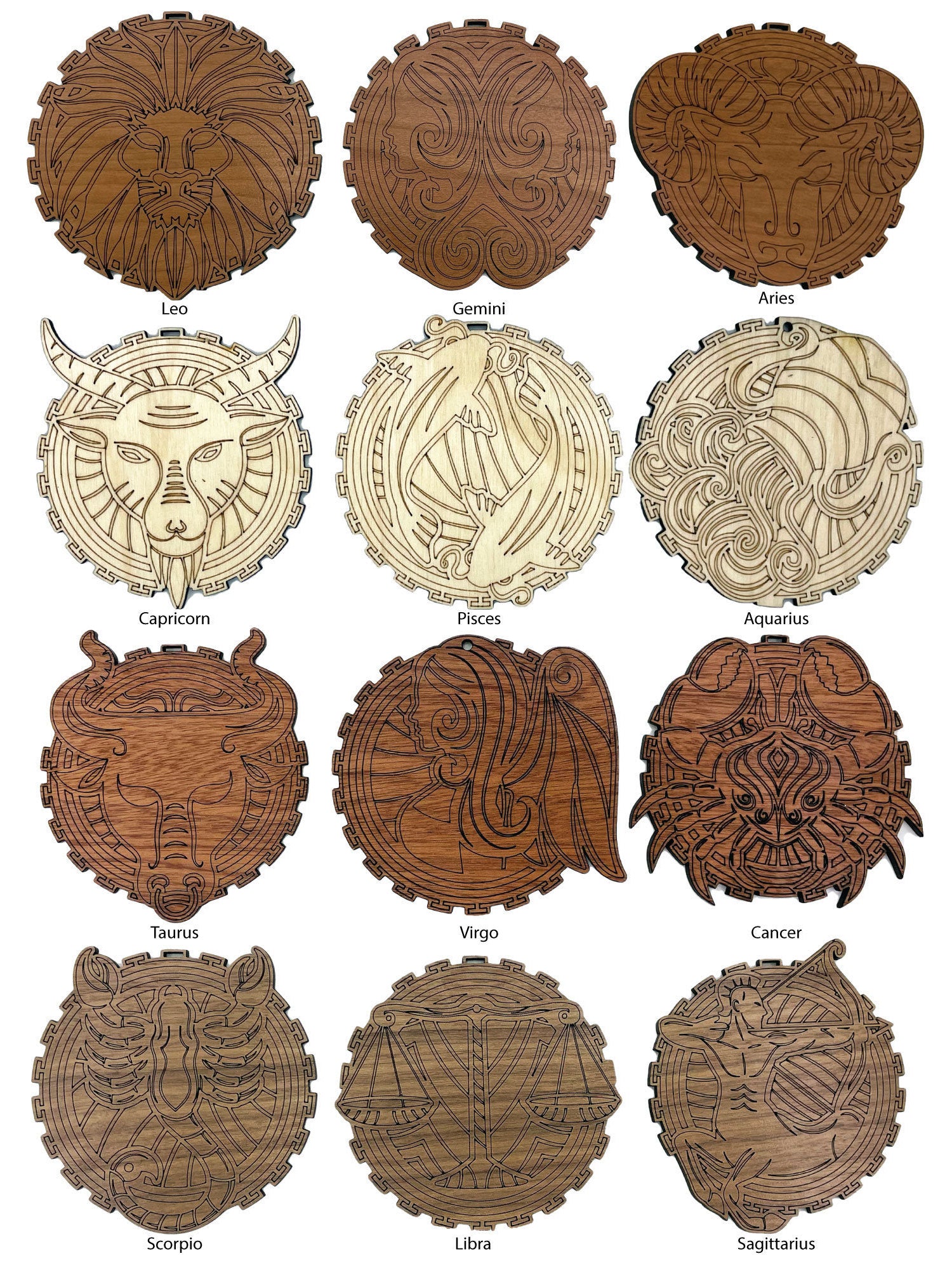 The astrological sign ornament is cut and engraved out of birch, cherry, sapele, or walnut and sealed to ensure the surface isn't easily damaged. It will arrive ready to hang with a jute string at the top.